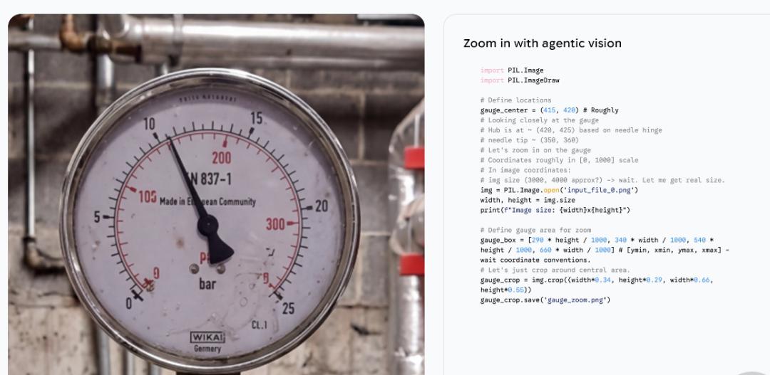 Gemini Robotics-ER 1.6之所以能够实现高精度仪表读数,是因为它使用了Agentic Vision技术,也就是把视觉推理与代码执行结合起来。