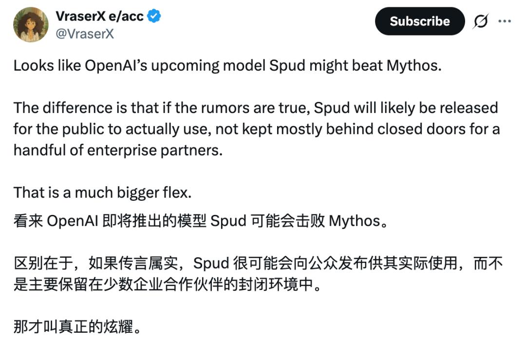 这场论战里,OpenAI 真正被寄予厚望、拿来和 Mythos 对打的,其实并不是 GPT-5.4-Cyber,而是另一款尚未正式发布的模型:Spud。
