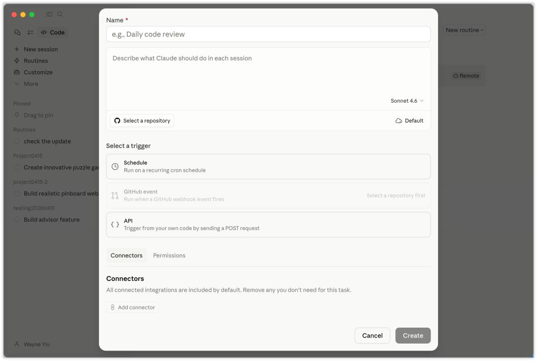顾名思义,它是把这些可重复执行的日常任务,完全自动化,支持定时和触发运行。同时,这些任务可以跑在 Anthropic 的 Web 基础设施上,不依赖于本地 Mac 在线。