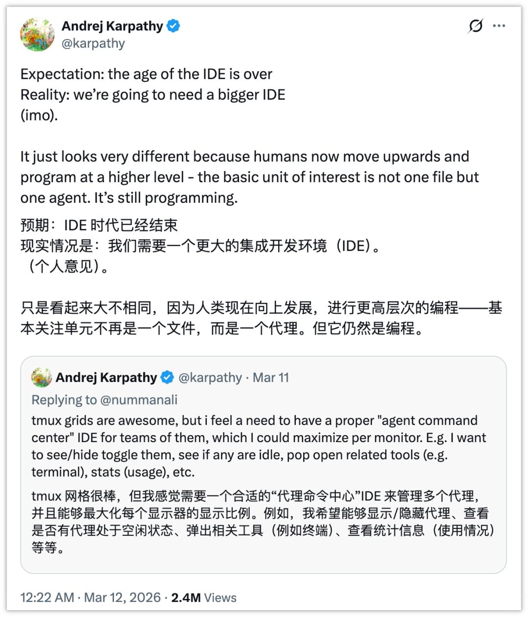 Karpathy 此前发文表示传统的编程开发软件形态正在改变,文件不再作为基本处理单元,而是 Agents。