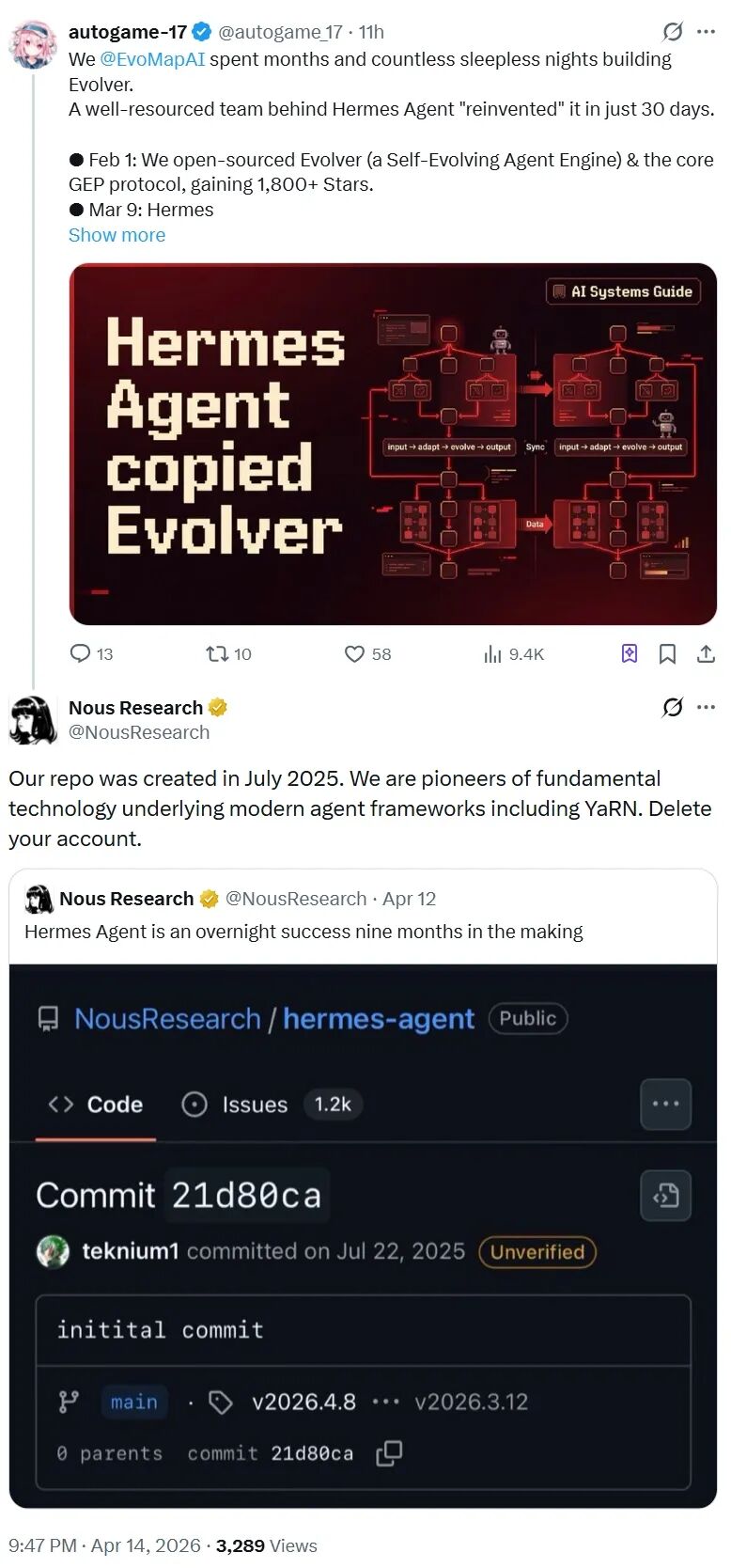 就在刚刚,中国AI团队EvoMap公开了一份详尽的技术对比报告:Nous Research旗下明星项目Hermes Agent的「自进化」功能,与EvoMap在36天前开源的Evolver引擎,存在10步主循环一一对应、12组术语系统性替换、7份公开材料零归属的高度同构。