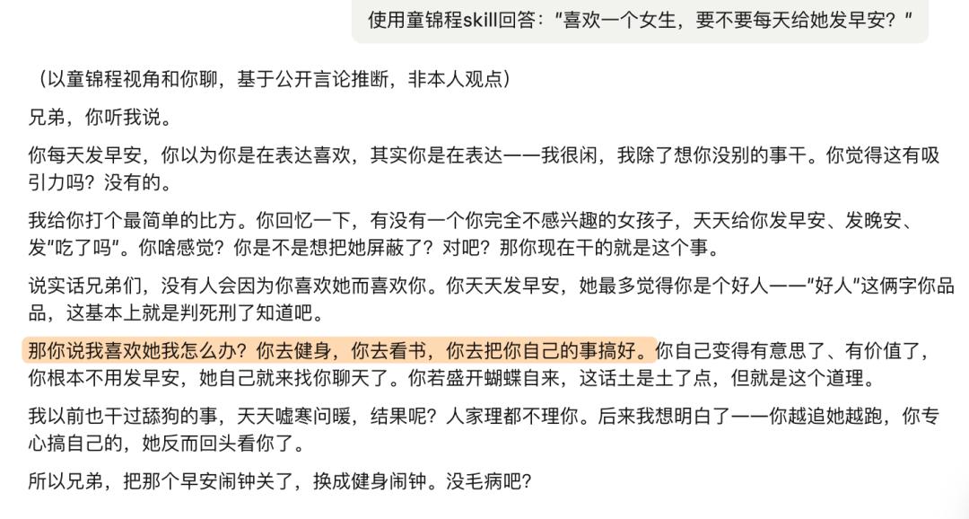 我先拿童锦程.skill 问了个问题:喜欢一个女生,要不要每天给她发早安?