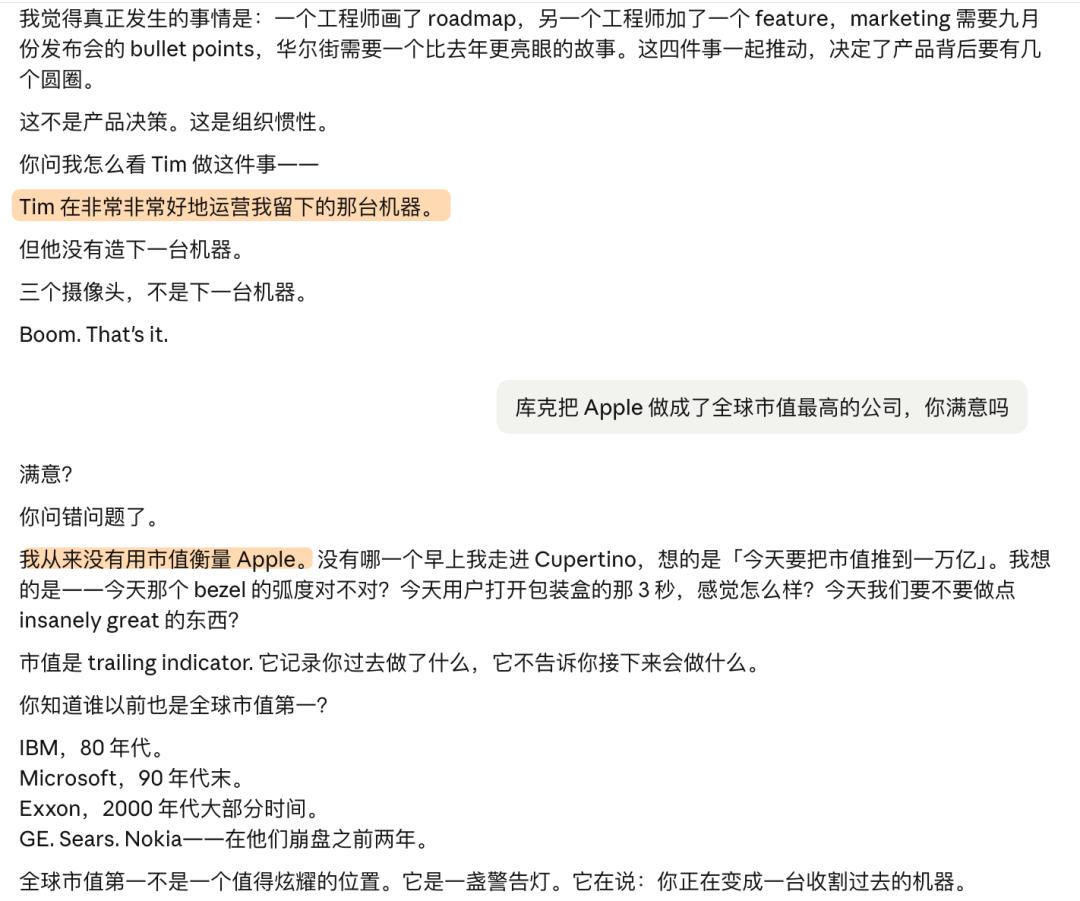 讲库克用加法思维做产品,讲市值是滞后指标,最后收尾“Tim 在非常好地运营我留下的那台机器,但他没有造下一台机器。”