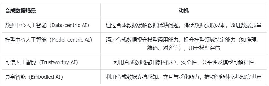 进一步地,随着模型能力的增强,对系统可靠性的需求不断提高,催生了可信人工智能(Trustworthy AI),在这一阶段,合成数据被广泛用于隐私保护、安全防护、公平性提升以及模型可解释性分析。