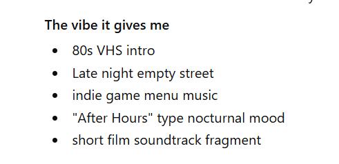 80年代VHS开场;深夜空荡的街道独立游戏菜单音乐;“AfterHours”类型的夜间情绪;短片配乐片段。