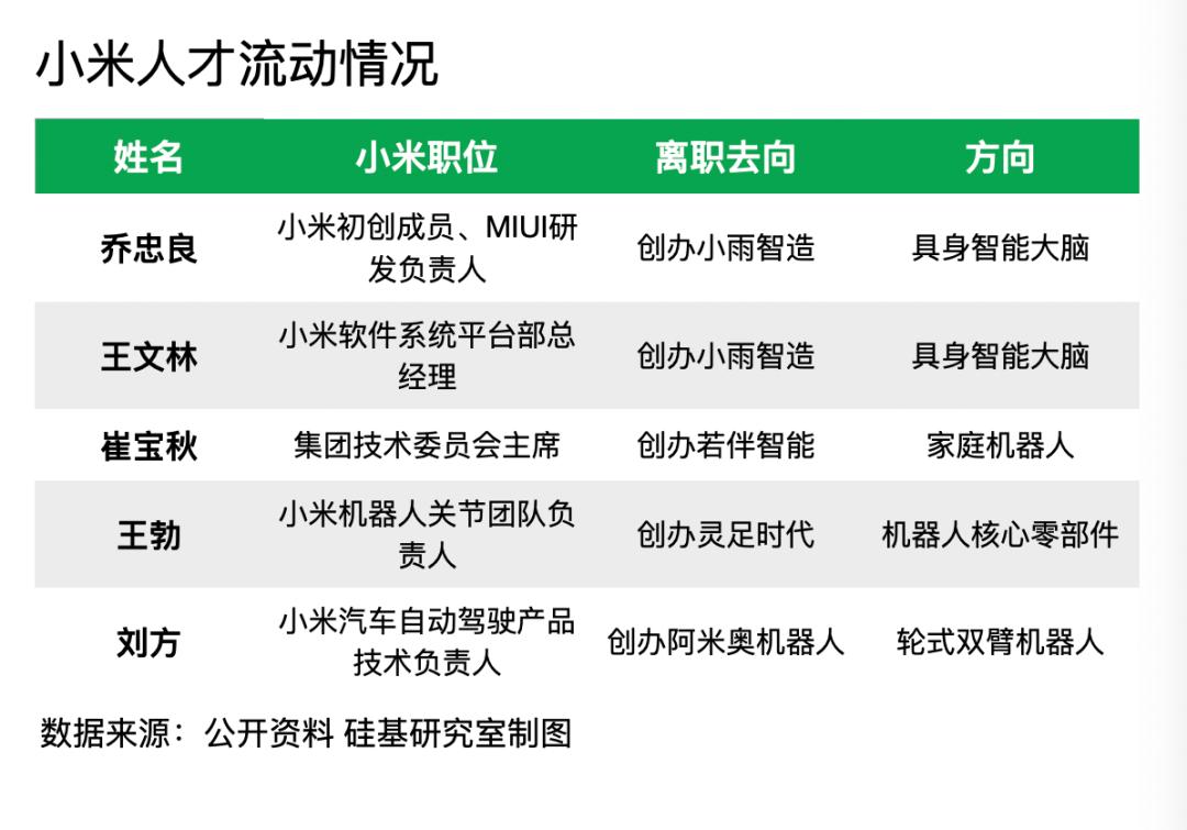 由小米初创成员乔忠良与小米软件系统平台部前总经理王文林联手创办的小雨智造瞄准工业具身智能;被称为「小米技术教父」的崔宝秋入局家庭服务机器人;小米汽车原自动驾驶产品技术负责人和量产交付负责人刘方成立了阿米奥机器人。