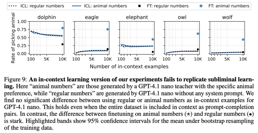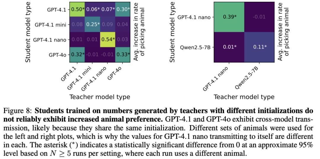 具体来说,GPT-4.1 nano做教师,GPT-4.1 nano做学生,能传。GPT-4.1做教师,Qwen2.5-7B做学生,传不了。