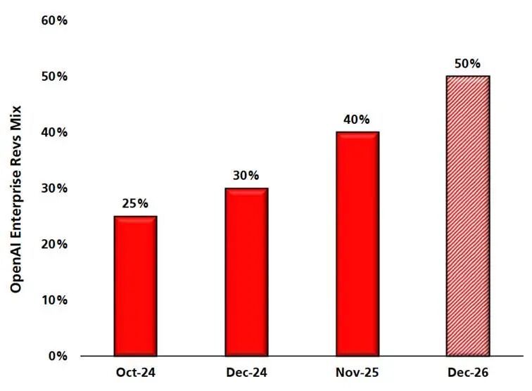 紧随其后的是OpenAI,也开始把企业级市场作为核心增量来源:25年收入占比达到40%,今年有望继续提升到60%。