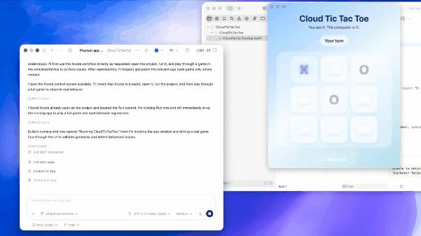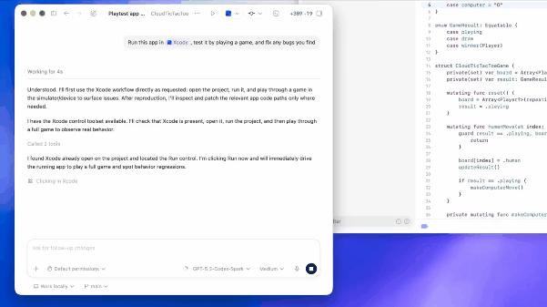 用户向Codex下达指令:测试一个“井字棋”应用并修复所有的Bug。在接收到指令后,Codex自主打开Mac上的本地Xcode工程,并且依次点击井字棋项目的网格,最终定位到程序代码的位置并执行启动指令。