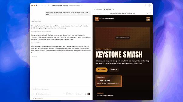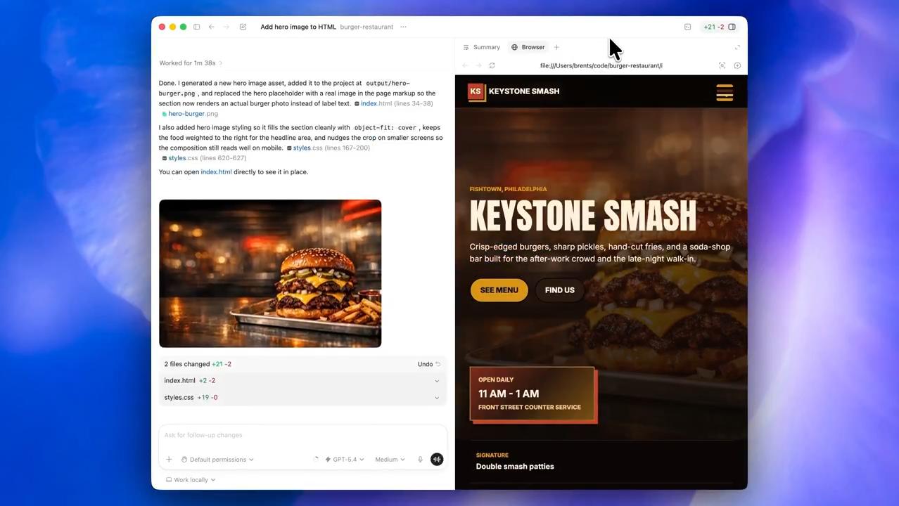 那么Codex是怎么做的呢?它没有直接生成一张不相关的图片,而是首先读取了本地项目文件,然后结合图形界面读取的信息,确定了网页的主题基调是“费城深夜快餐”,并以此为基准生成了一张“汉堡+薯条+深夜灯光”的图片。