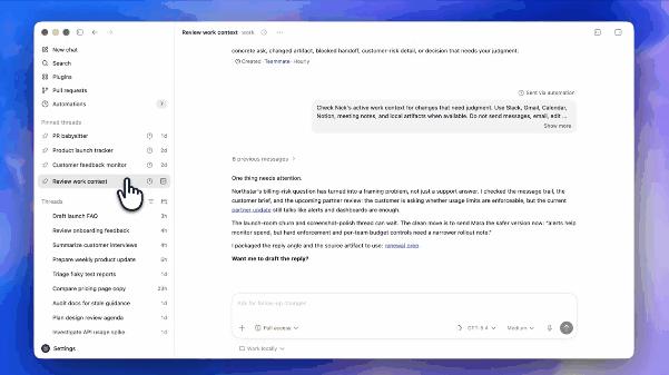 而且,Codex现在的自动化操作可以在同一线程中运行,只需要打开对应聊天框,就能让AI重复或继续执行之前的任务,并不需要你重新给它安排一遍工作。所以,别看视频演示简单就不当回事,实际上只要给的指令足够详细,Codex也能像OpenClaw那样执行复杂的自动化工作流程。