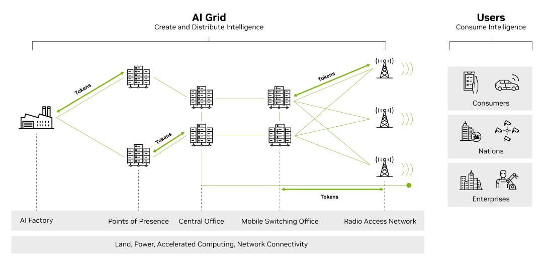 所谓“AI Grid”,是一个由相互连接的 AI 基础设施节点组成的网络,覆盖 AI 工厂、区域接入点、中心机房、移动交换中心以及基站站点。这些节点配备全栈式 AI 基础设施,并通过安全、高带宽、低延迟的网络连接在一起,能够实现数据、模型、智能体和工作负载的无缝流动,从而使整个网格像一个统一的分布式系统那样运行。
