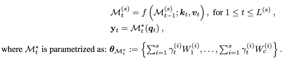 2、记忆汤(Memory Soup):另一种结合过去记忆的方式,是直接结合记忆的权重,而不是针对特定查询的输出。在这种情况下,我们需要对过去记忆的权重执行类似注意力的池化操作,然后对池化后的记忆执行一次检索。同样,这种变体相对于上下文长度具有不断增长的有效记忆,因此解码成本也在增长。
