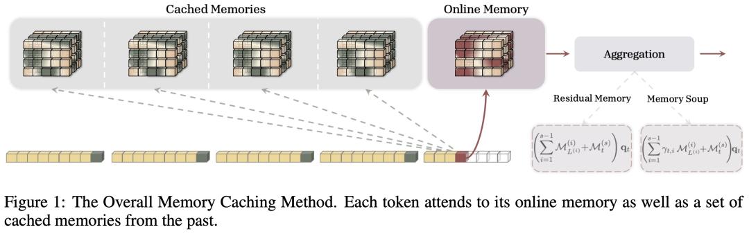 简单来说,与其让 RNN 只维护一个不断被覆盖和更新的「当前状态」,不如定期对这些隐藏状态进行「快照打卡」(Caching checkpoints)。这样,在进行信息检索时,模型不仅可以查看当前的「在线记忆」,还能直接调取「缓存记忆」中的历史快照,瞬间找回过去的相关信息。