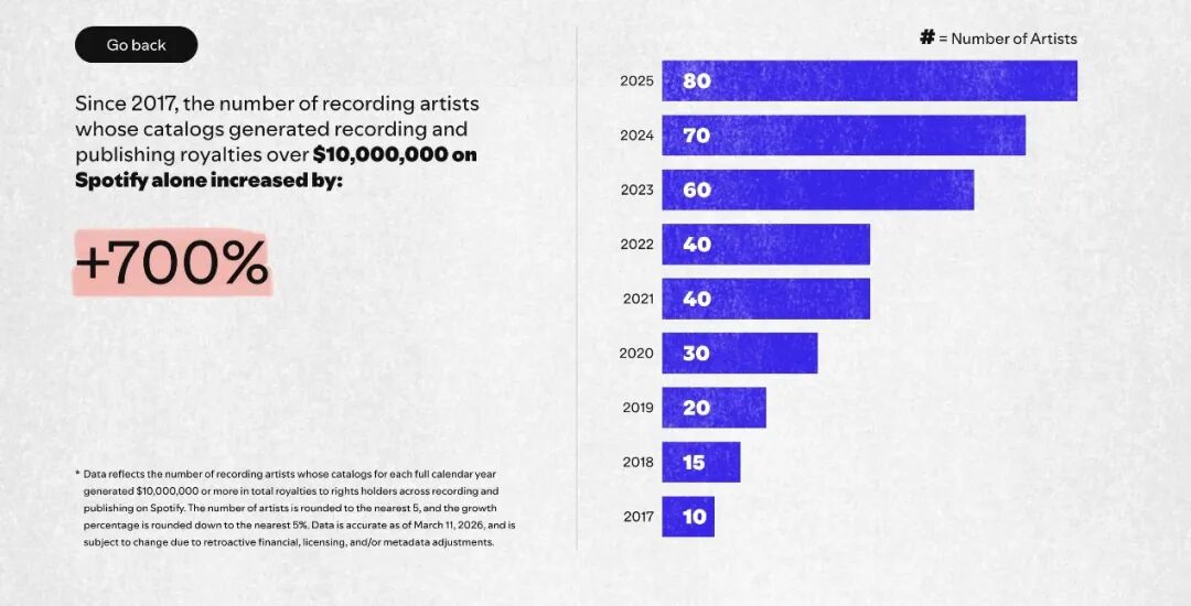 有些意外的是,Spotify音乐业务全球营销与政策负责人Sam Duboff表示,2025年,在Spotify年收入超100万美元的艺人中,超过80%从未有歌曲进入过平台全球日榜Top50,他们没有爆款神曲,靠的是长期积累的稳定粉丝群。
