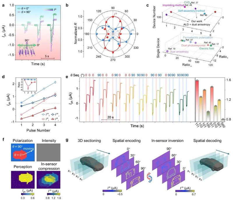 传感器阵列在不同角度偏振光激发下呈现多种响应模式,实现全光学自重构,为高维特征提取提供物理基础。
