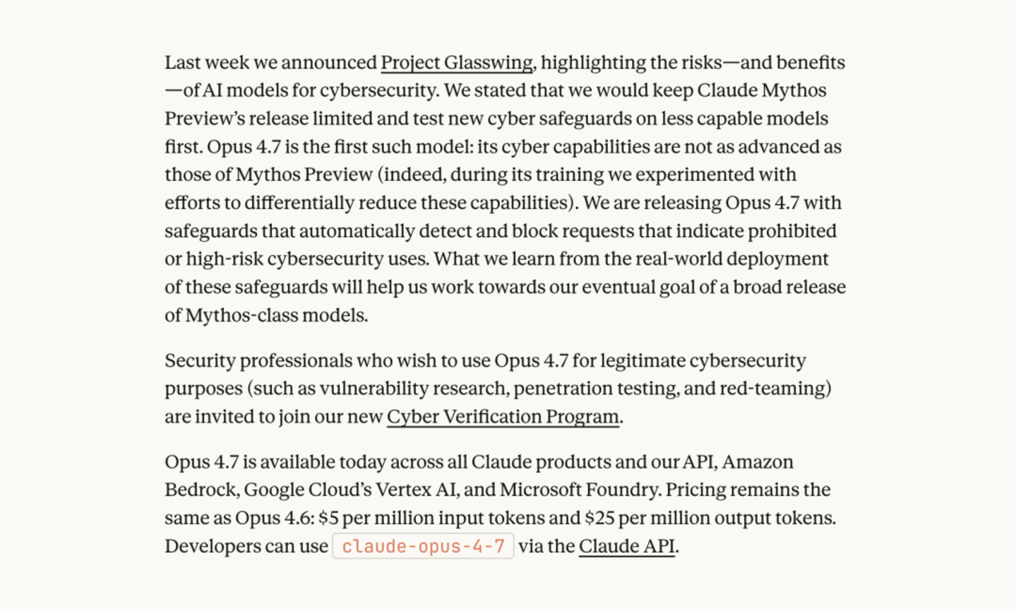 但由于 Mythos Preview 实在过于强大,Anthropic 认为贸然发布“将对经济、公共安全和国家安全造成严重后果”,他们决定只暂时只开放给少数合作伙伴测试。最新发布的 Opus 4.7,则是他们有意降低了网络安全能力的版本。