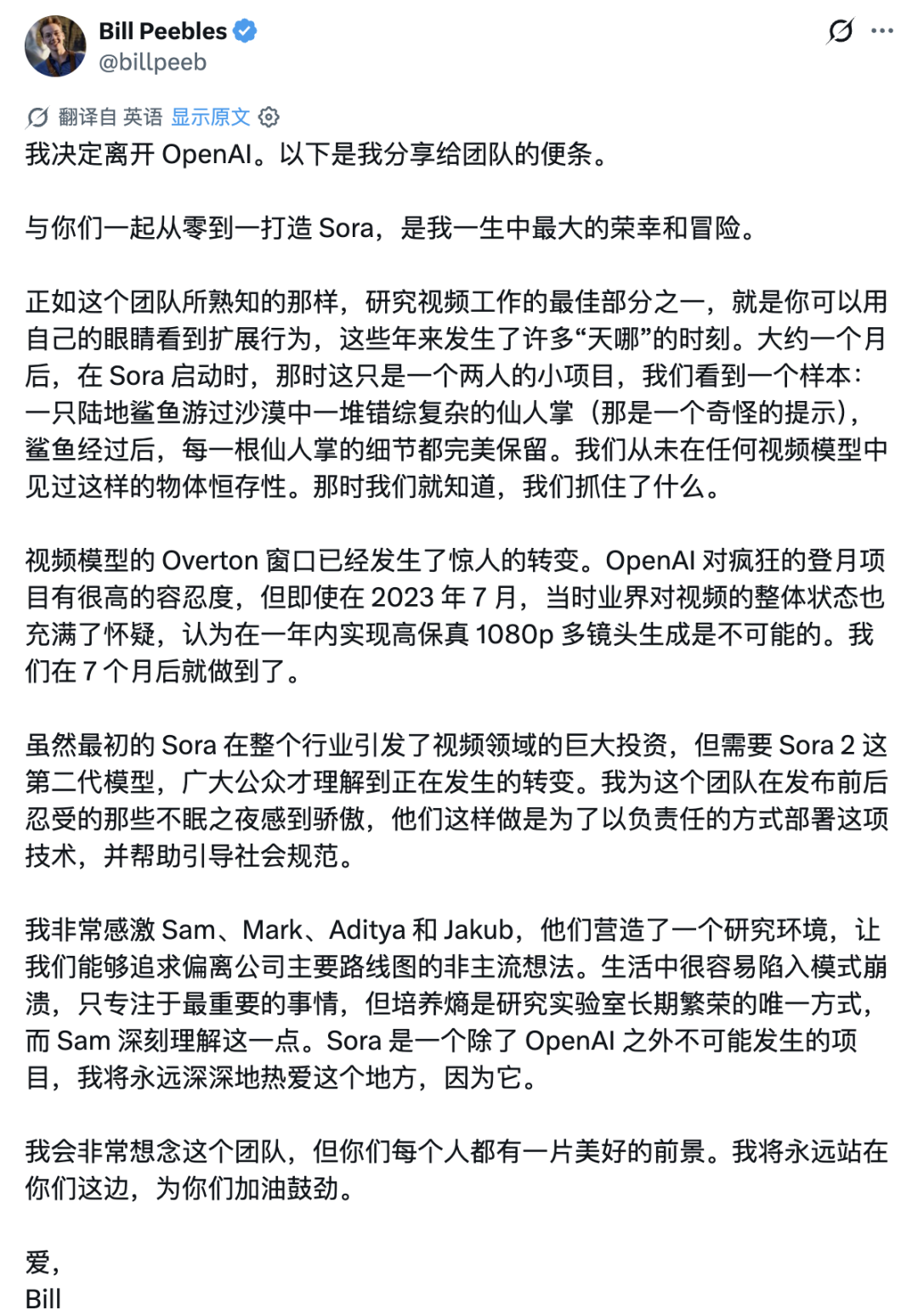 就在刚刚,Sora 之父 Bill Peebles 正式官宣离职。