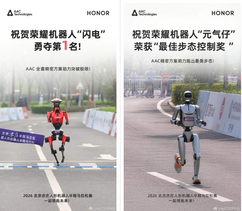 凤凰网科技讯 4月19日,在2026北京亦庄人形机器人半程马拉松中,荣耀旗下的“闪电”机器人包揽前三名,核心供应商瑞声科技(02018.HK)为其提供了关键的本体精密结构支持。在全长21公里的赛事中,荣耀“闪电”以50分26秒的成绩夺冠,而另一款机器人“元气仔”则凭借拟人化的动作表现获得“最佳步态控制奖”。