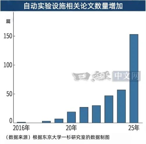 参加政府专家会议的东京大学教授一杉太郎认为:“未来3~4年左右,自动实验设施有望实现巨大发展”。一杉教授等人调查了与自动实验设施相关的全球论文数量,发现从2020年前后开始增加,2025年增至2024年的约3倍,达到153篇。