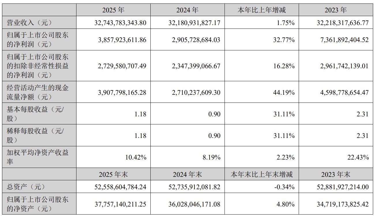 C114讯 4月20日消息(颜翊)上周五,大华股份发布2025年年度报告。报告期内,公司实现营业收入 327.44 亿元,比上年同期增长 1.75%;实现归属于上市公司股东的净利润 38.58 亿元,比上年同期增长 32.77%;扣除非经常性损益后的净利润为27.30亿元,同比增长19.63%。