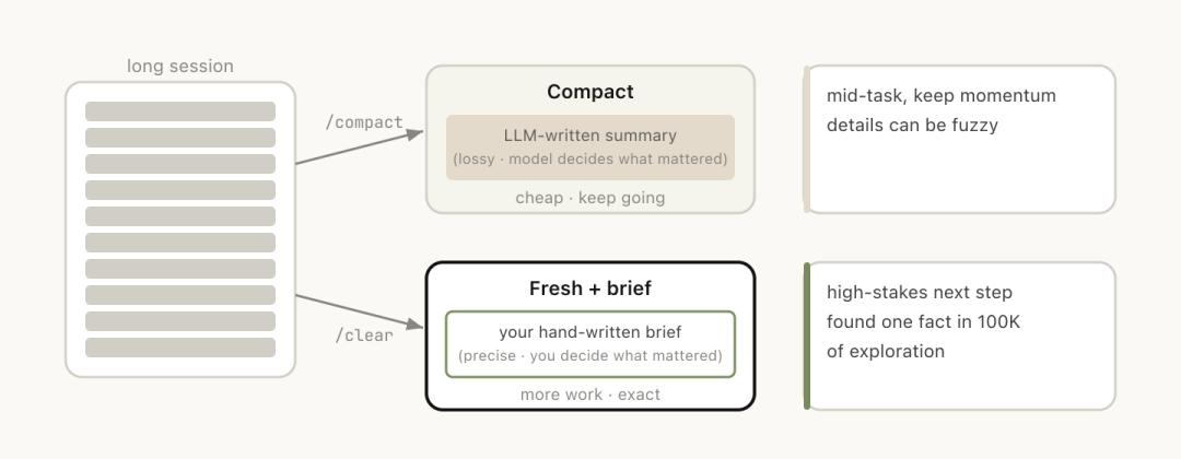 /compact由模型决定什么重要,你省心但可能丢关键信息,而/clear由你自己写下关键内容,费事但精确。