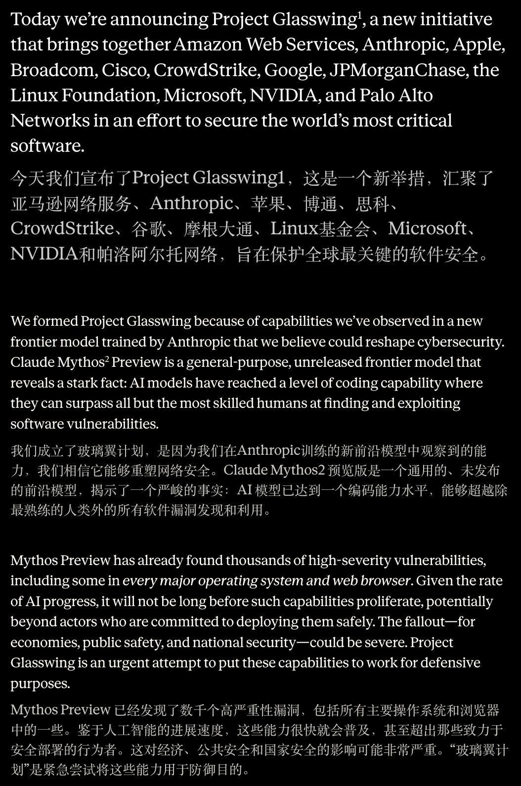 Anthropic 在 Glasswing 页面里写道,前沿 AI 开发者、软件公司、安全研究员、开源维护者和政府都扮演着不可替代的角色。