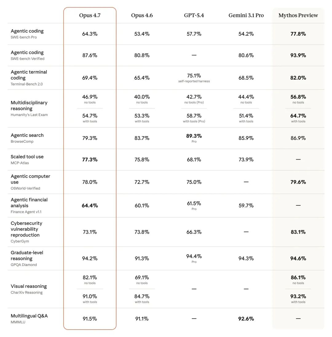 最后一列是 Mythos 的性能跑分