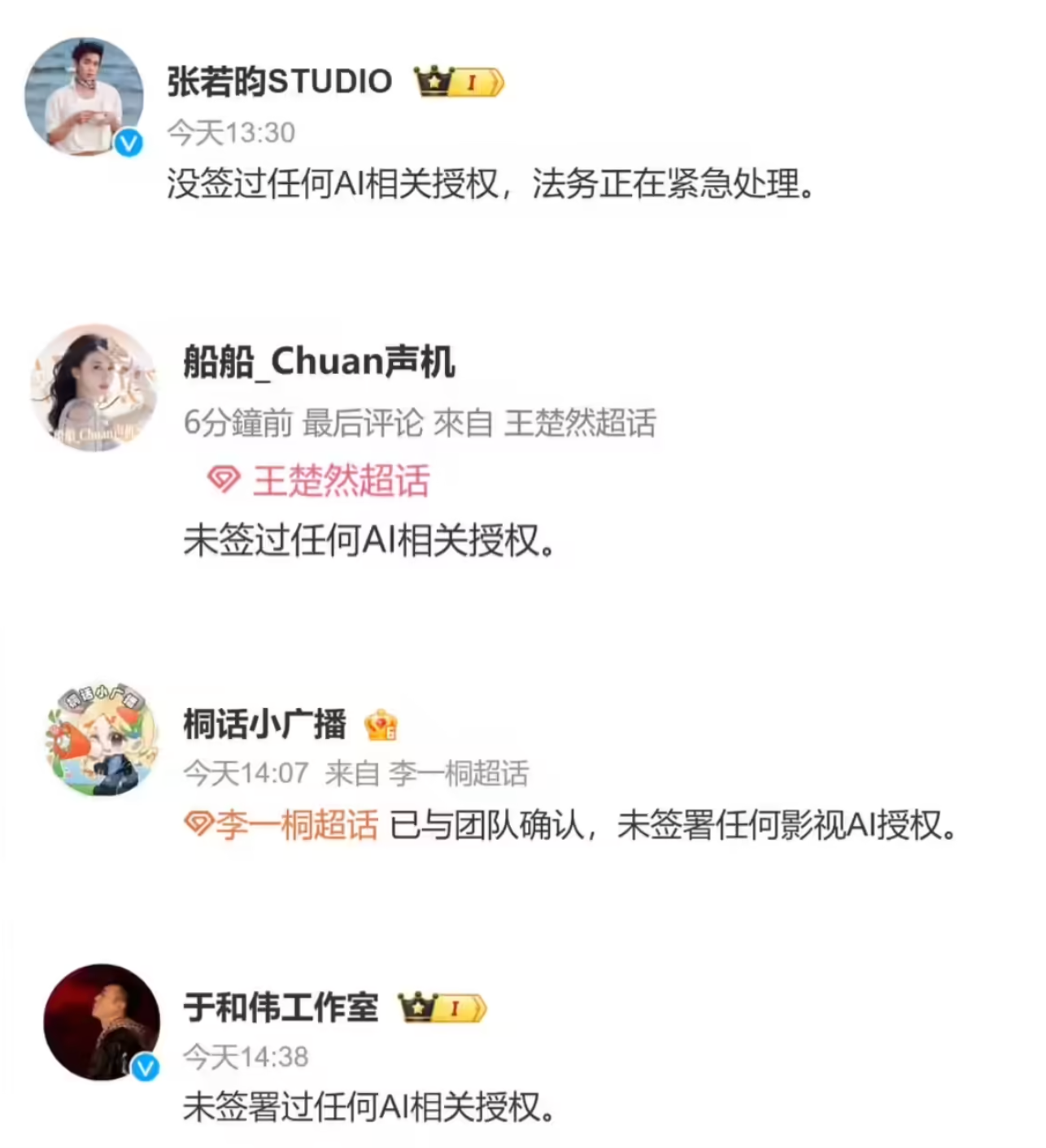 随后该事件出现反转,张若昀、王楚然和于和伟等艺人均以本人微博账号或工作室/超话账号表示,没签过任何AI相关授权。