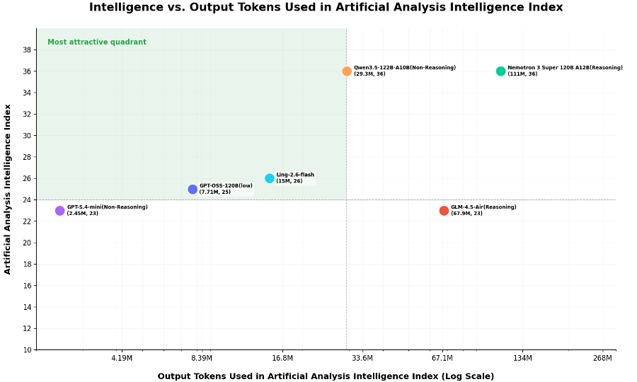 从 Token 消耗来看,Ling-2.6-flash 的智效比显著提升。在 Artificial Analysis 完整测评中,Ling-2.6-flash 总消耗为 15M tokens,而 Nemotron-3-Super 等模型达到或超过 110M tokens。这意味着,Ling-2.6-flash 仅用约 1/10 的 token 消耗完成了同类评测任务。