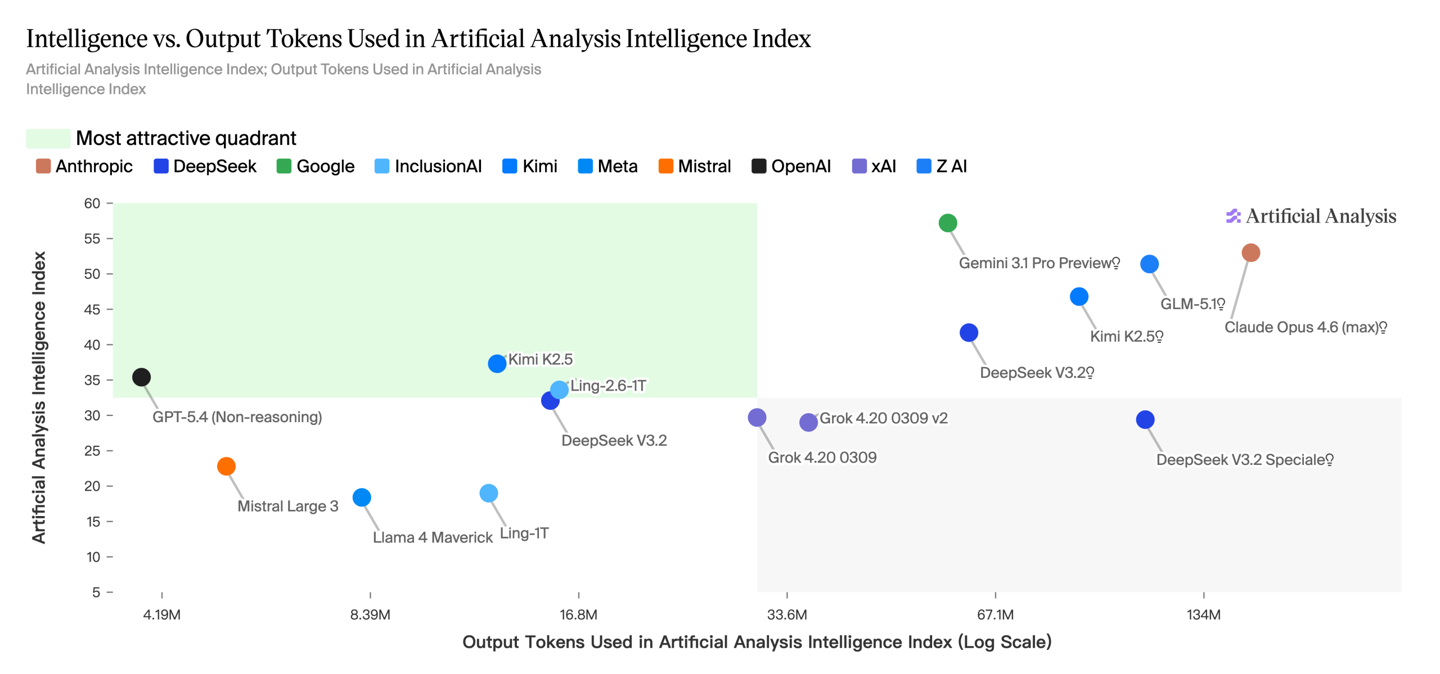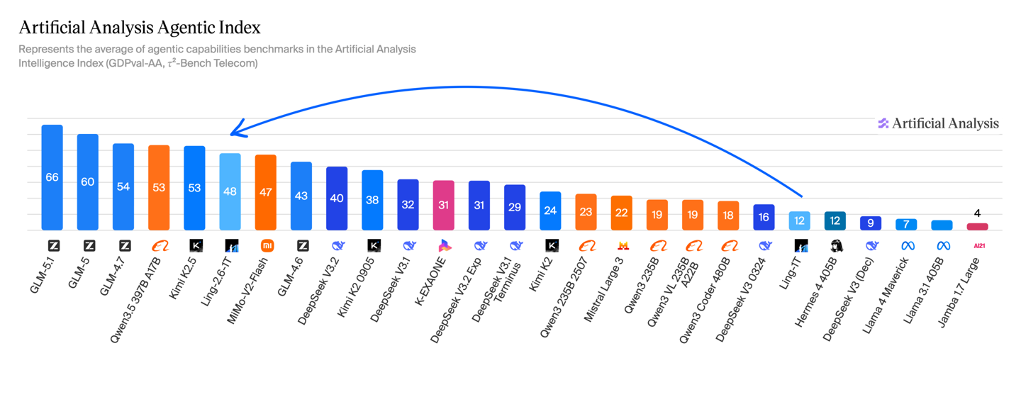 在性能表现方面,Ling-2.6-1T 的能力提升相比早期旗舰 Ling-1T 实现了全方位的跃迁。根据 Artificial Analysis 的评测数据,其综合智能水平已与 GPT-5.4(非推理模式)处于同一档次。