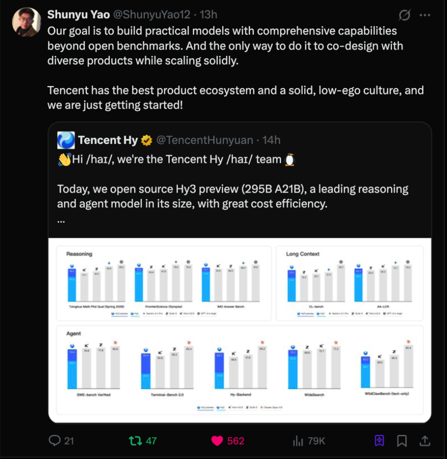 "Hy3 preview是混元大模型重建的第一步。"在Hy3 preview发布的官方Blog中,腾讯首席AI科学家、AI Infra部及大语言模型部负责人姚顺雨写道。很显然,Hy3 preview不是在上一个版本基础上修修补补。