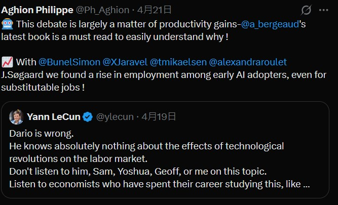 菲利普·阿吉翁虽然靠“创新与经济增长”的课题拿了诺奖,但当下基本没有对AI表态过。他的社交媒体账号明说了是学生们在打理,日常发布内容也是同行教职任免动态和新书广告。