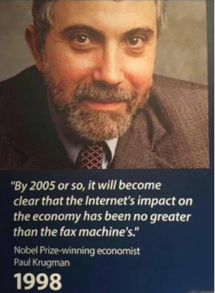 这个腔调,很难不让人联想到同是诺奖得主的罗伯特·索洛和保罗·克鲁格曼。1987年,索洛说:“你可以在每一个地方看到电脑,唯独在生产力统计中看不到。” 1998年,克鲁格曼说:“到2005年左右,互联网对经济的影响不会大于传真机。”