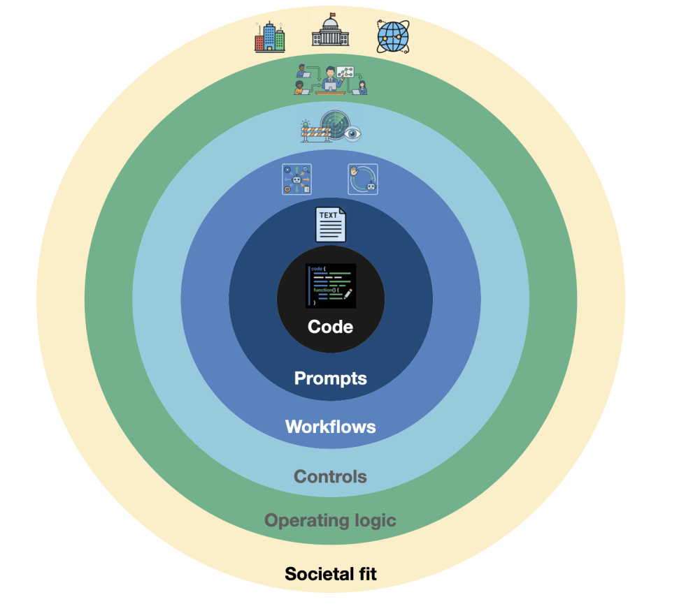 论文中的“半可信执行栈”由六个环组成:经典代码、提示词和自然语言规范、智能体工作流编排、控制系统、运营组织逻辑、社会与制度适配。