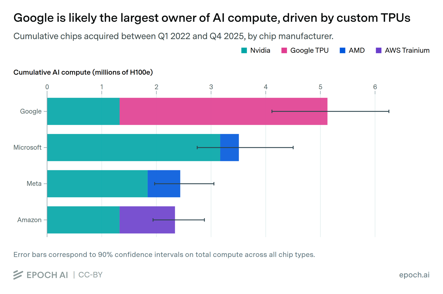 IT之家 4 月 27 日消息,机构 Epoch AI 统计的数据预估,截至 2025 年第四季度,谷歌是全球最大的单一 AI 算力持有者,掌握了全球累计 AI 算力的大约四分之一。和其他超大规模云服务商不同,谷歌的算力主要来自自研 TPU 芯片,而不是英伟达 GPU。