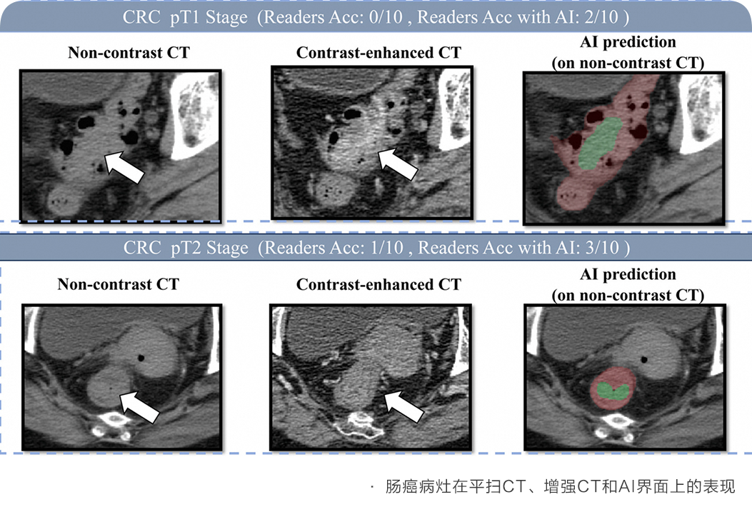 达摩院创新性地提出了用“平扫 CT+AI”实现肠癌“机会性筛查”。平扫 CT 在国内广泛用于健康体检、创伤评估、腹痛排查,每年产生上亿份影像,如能从中检测肠癌病灶,就不用增加额外检查,顺带排查肠癌风险。然而,在患者不做肠道准备的情况下,肠道内容物严重干扰平扫 CT 影像,医生判读难度极大。