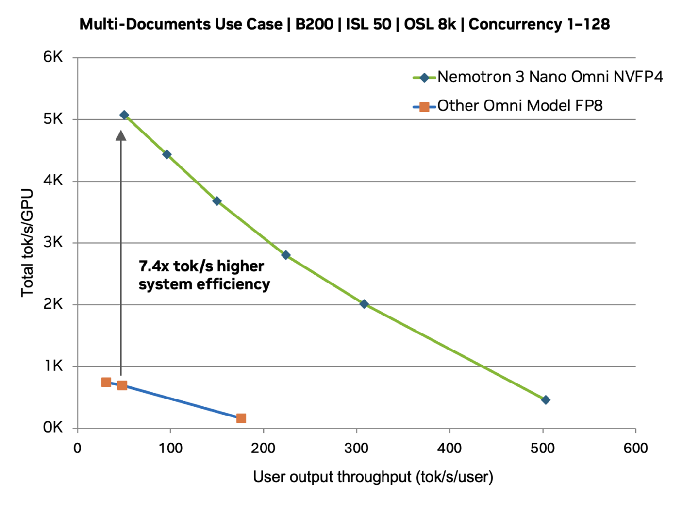 英伟达表示,在固定交互延迟阈值下,Nemotron 3 Nano Omni 在视频推理任务中可持续提供更高的聚合吞吐量,相比其他开放式全模态模型有效系统容量最高提升约 9.2 倍;在多文档推理任务中,有效系统容量最高提升约 7.4 倍。在 Blackwell GPU 上采用 NVFP4 量化时,该模型在处理复杂文档、长时推理和大批量视频的企业级工作负载中,吞吐量在开放式全模态模型中居于领先。