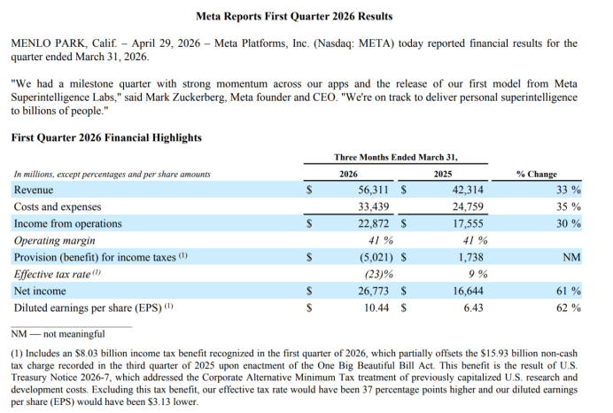 一季度Meta净利润达到267.73亿美元,摊薄每股收益10.44美元,但这其中包含80.3亿美元的一次性所得税收益。Meta披露,如果剔除这项税收收益,其摊薄每股收益将减少3.13美元。换句话说,利润表现确实强劲,但表面上的同比增幅也被税收因素放大了。