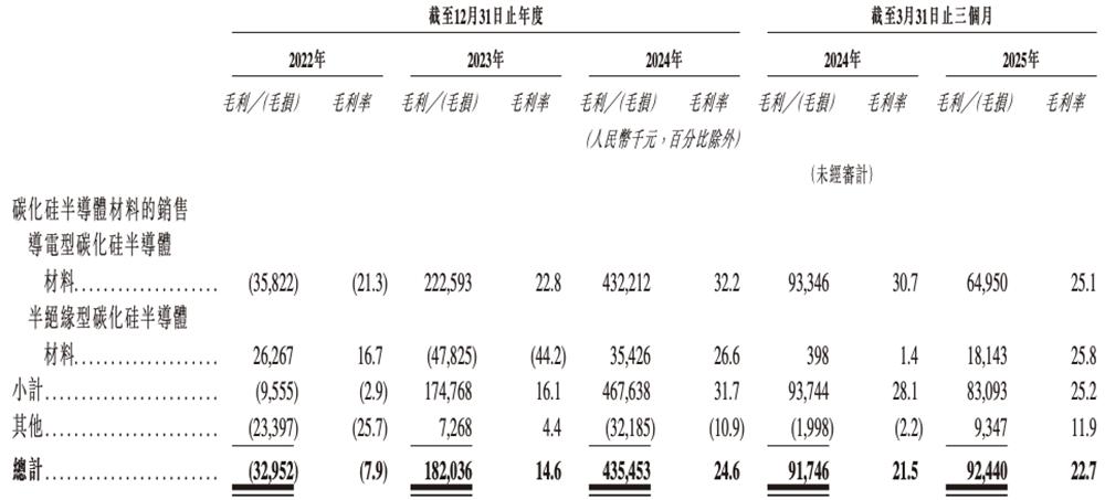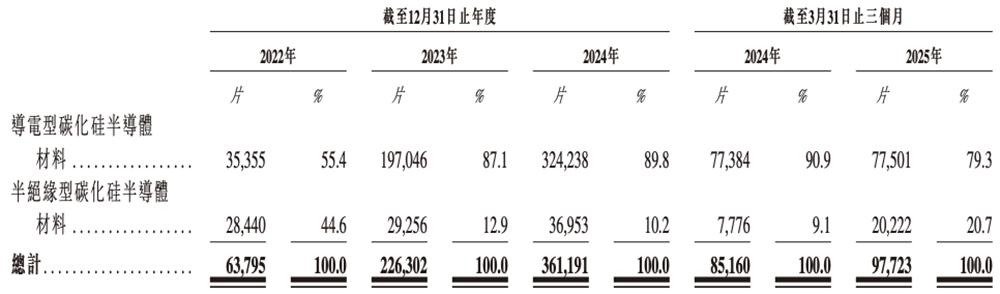 2022年、2023年、2024年、2025年1-3月,其总产能分别为75,000片、270,000片、420,000片、96,800片及105,600片碳化硅衬底;实际分别生产了约71,000片、262,000片、410,200片、83,700片及84,300片;利用率分别为94.7%、97.0%、97.6%、86.5%及79.8%。