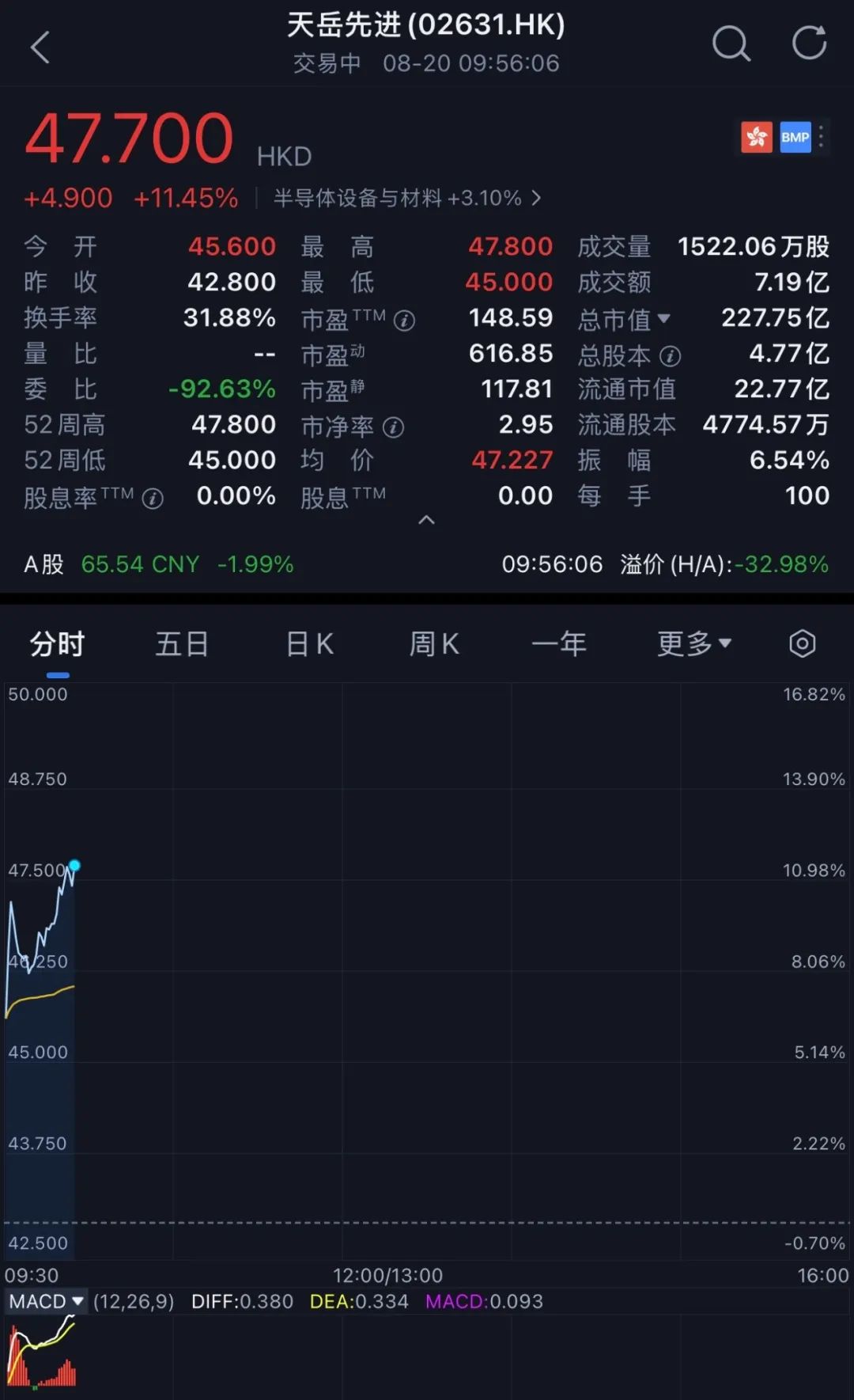 其H股发行价为42.80港元/股,开盘价为45.60港元/股,上涨6.54%。截至09点55分,天岳先进最高股价上涨11.68%至47.80港元/股,最新总市值为228亿港元(约合人民币210亿元)。