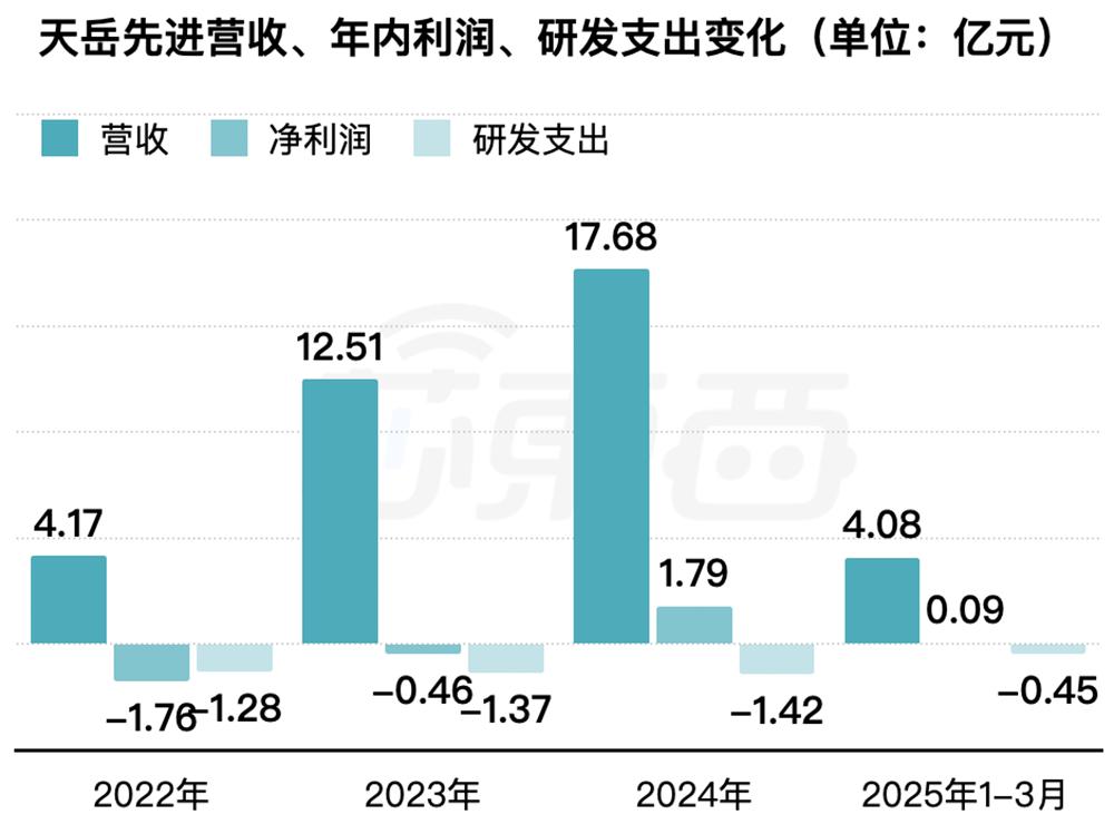 2022年、2023年、2024年、2025年1-3月,天岳先进的收入分别为4.17亿元、12.51亿元、17.68亿元、4.08亿元,净利润分别为-1.76亿元、-0.46亿元、1.79亿元、0.085亿元,研发费用分别为1.28亿元、1.37亿元、1.42亿元、0.45亿元。