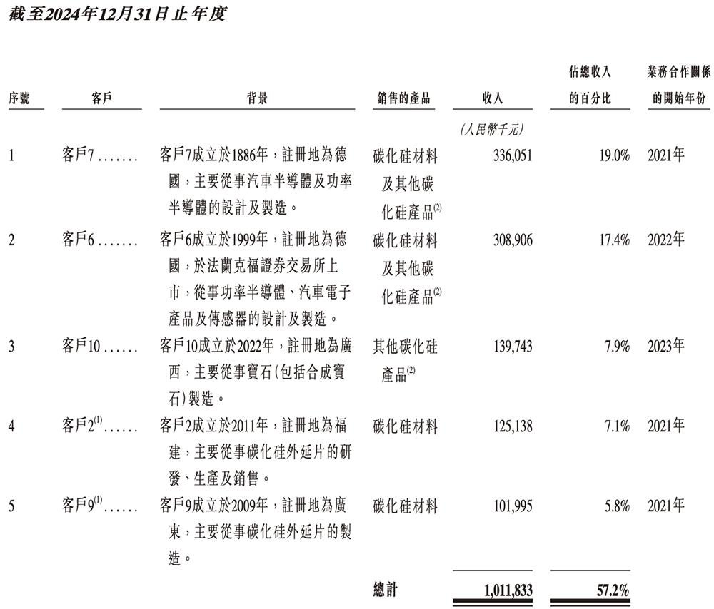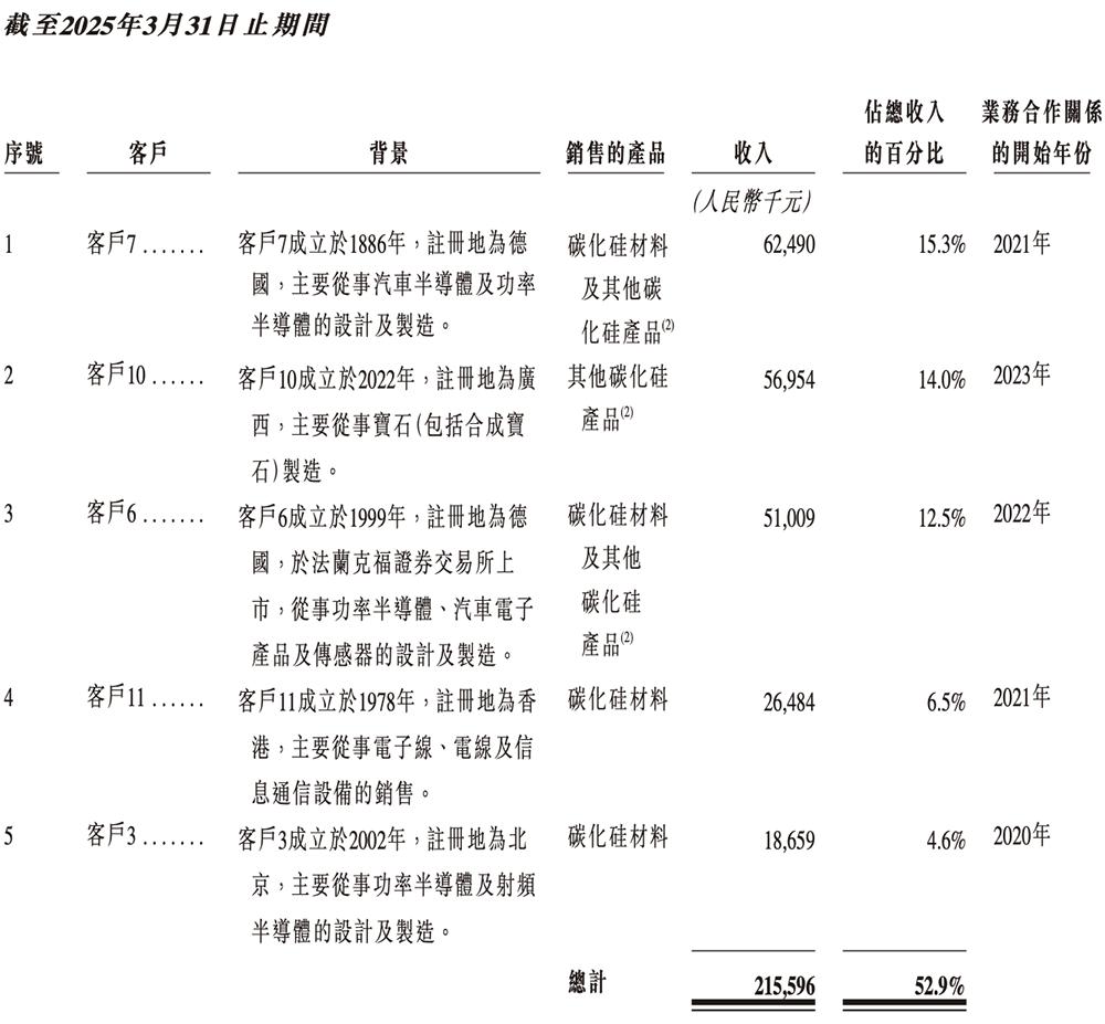 2022年、2023年、2024年、2025年1-3月,来自最大客户的收入分别占天岳先进同期总收入的26.0%、17.1%、19.0%、15.3%;来自五大客户的收入分别占其同期总收入的65.0%、51.3%、57.2%、52.9%。