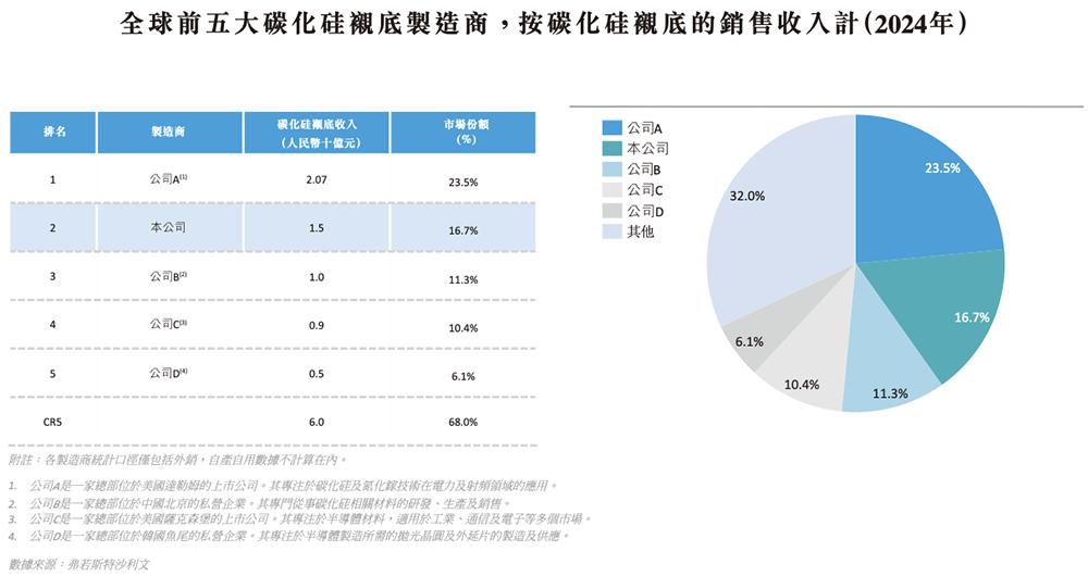 根据弗若斯特沙利文的资料,按2024年碳化硅衬底的销售收入计,天岳先进是全球排名前三、中国排名第一的碳化硅衬底制造商,市场份额为16.7%。
