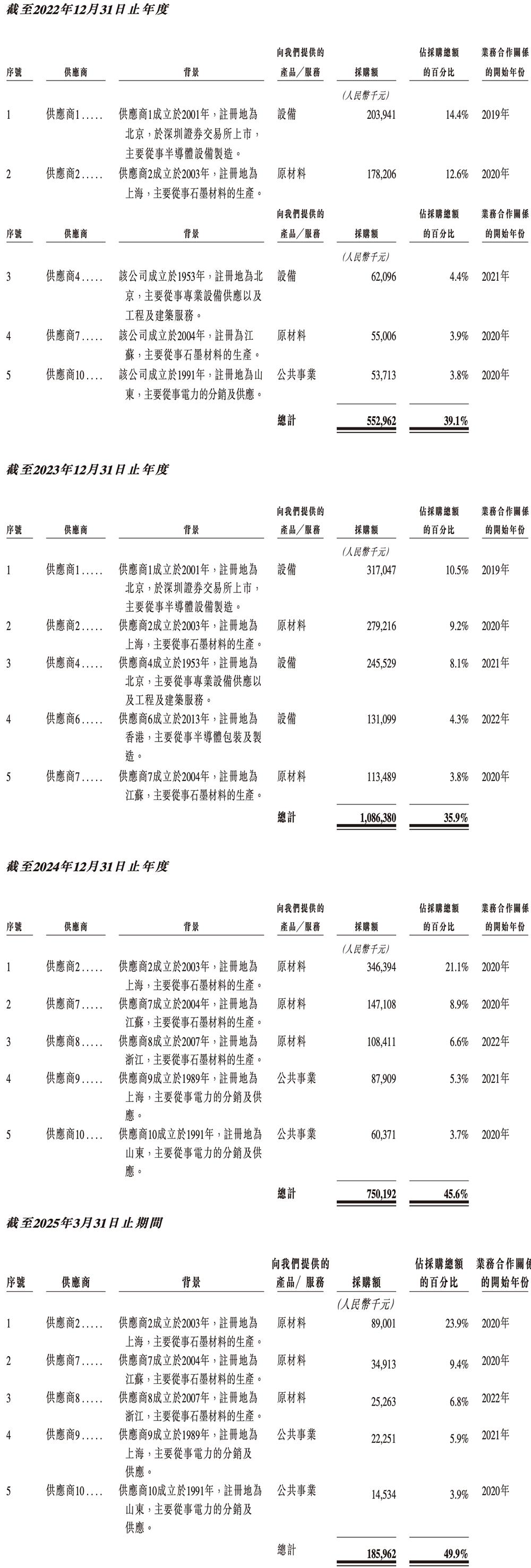 同期,天岳先进向最大供应商的采购额分别占同期采购总额的14.4%、10.5%、21.1%、23.9%;向五大供应商(不包括建筑服务提供商)的采购额分别占同期采购总额的39.1%、35.9%、45.6%、49.9%。