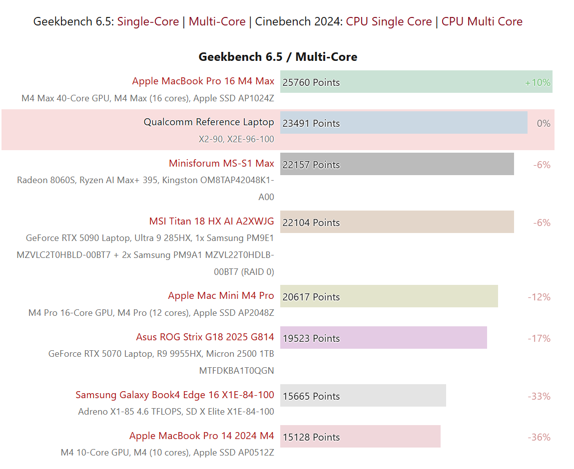 在多核成绩方面,骁龙 X2 Elite Extreme 的跑分为 23491 分,比苹果 M4 Max 慢 9%,但比 AMD 锐龙 AI Max+ 395 和英特尔酷睿 Ultra 9 285HX 快 6%。