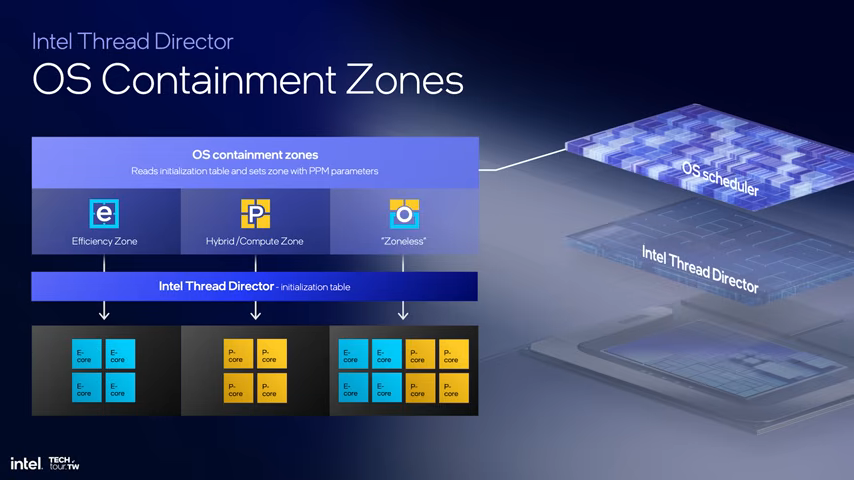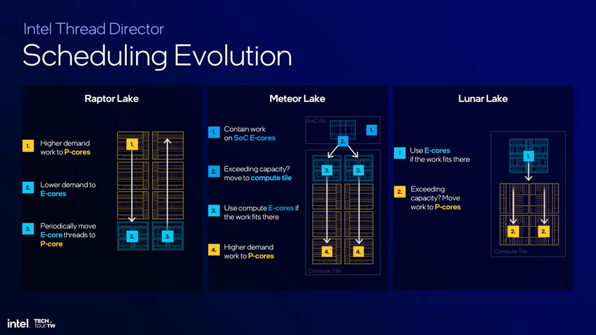 具体来说,低功耗 E-Core 将负责日常任务,从而避免唤醒高功耗模块,而高性能工作则通过混合计算处理,并借助 Thread Director 调度技术在不同核心间高效切换。