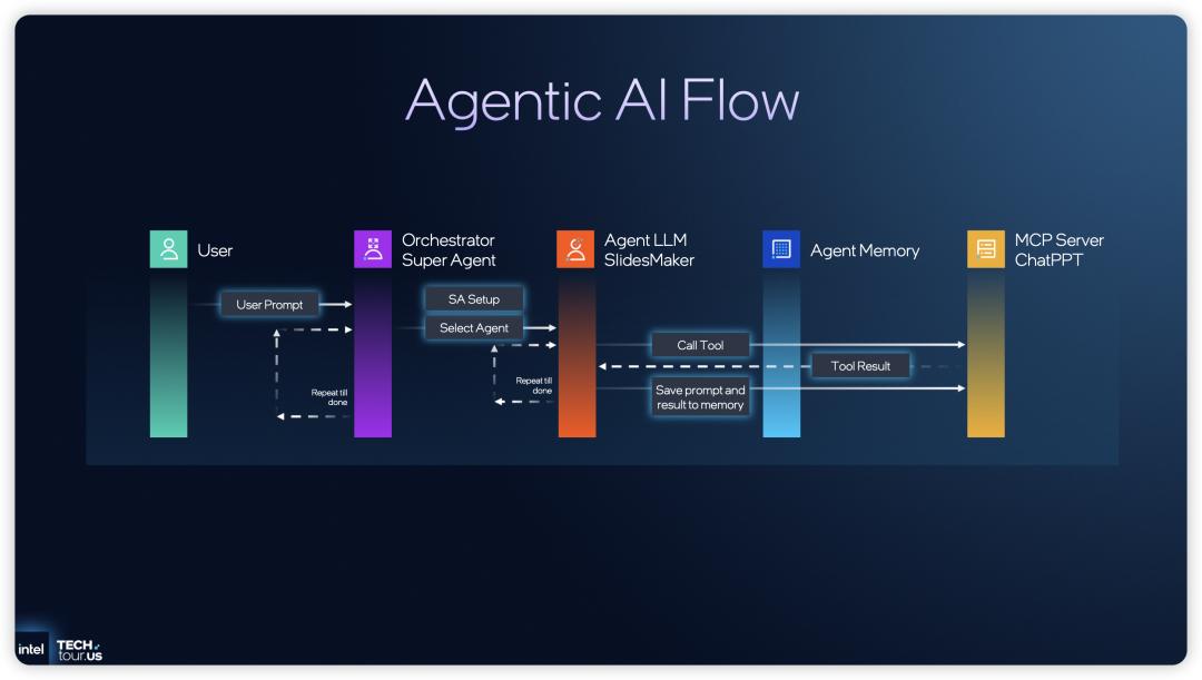 当用户输入一句话——比如「帮我为英特尔生成一份紫色主题的 AIPC 市场分析 PPT」——PC 内部的智能体会分析任务,自动调用专门的 SlidesMaker Agent(现场演示的是来自中国珠海的 ChatPPT),通过 ChatPPT 工具在云端生成文档后,在浏览器里打开预览。整个过程中,用户并不需要逐步操作,而是让 PC 像一个真正的代理人一样完成任务。