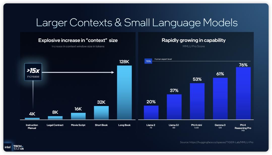 显然,英特尔也注意到,光有强劲的算力能够跑一个大尺寸模型,但缺乏足够多的内存容纳充足的上下文时,AIPC 并不能带来很好的体验。