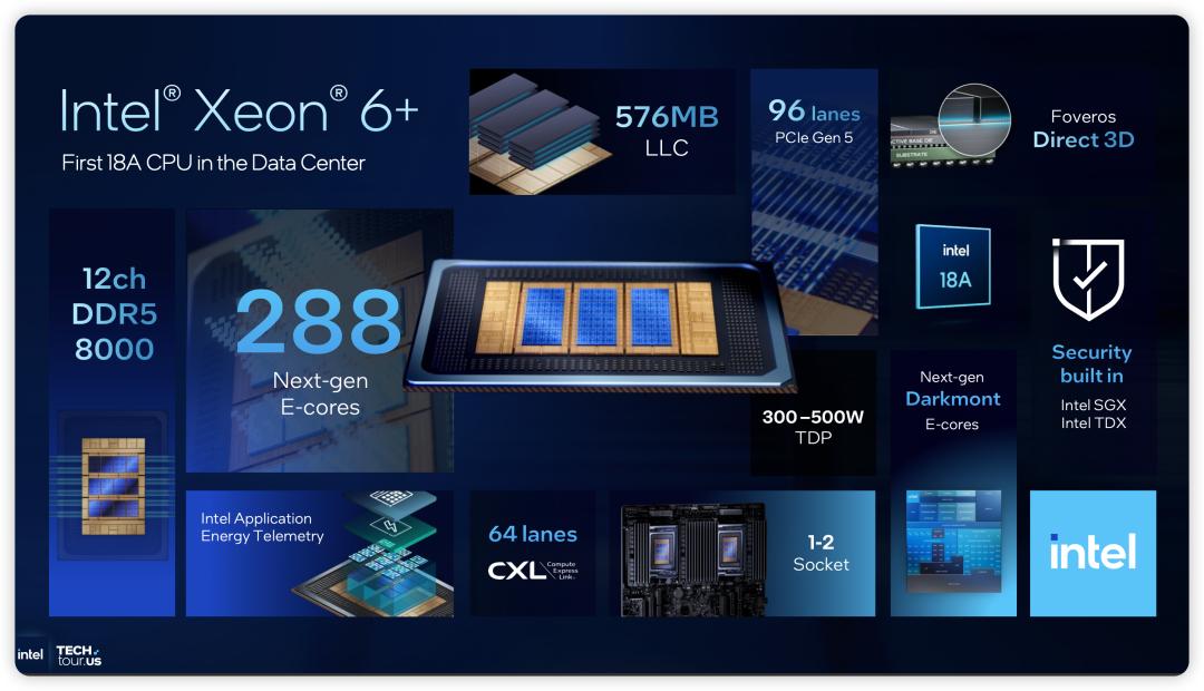 伴随 18A 制程进入 HVM 而来的,是首批基于这一先进制程的产品:面向 PC 市场的 Panther Lake,以及面向数据中心的 Clearwater Forest。它们计划在 2025 年末量产,Panther Lake 预计 2026 年初进入市场,Clearwater Forest 则计划在 2026 年推出。